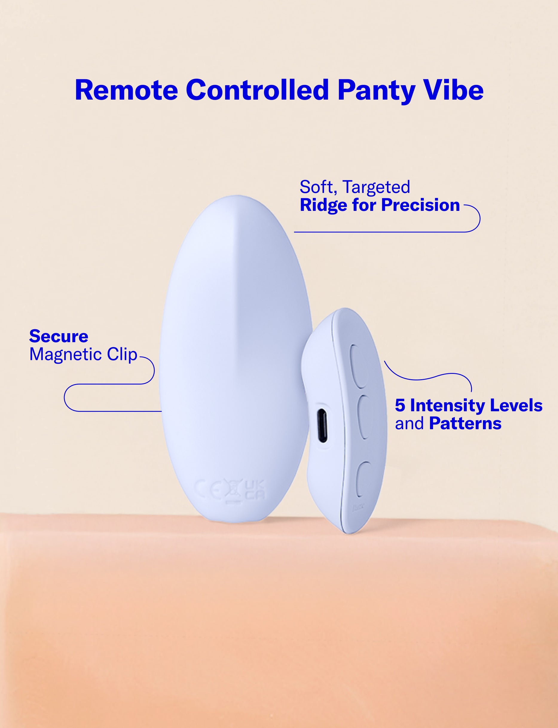 Place Lay inside your underwear with the curved side resting against your body, positioning the soft ridge where it feels best for you. Use the magnetic clip to secure it in place—its ergonomic shape is designed to stay comfortably put while you move. Turn it on with the single button or control it with the remote, and explore the different speeds and patterns until you find what you like.